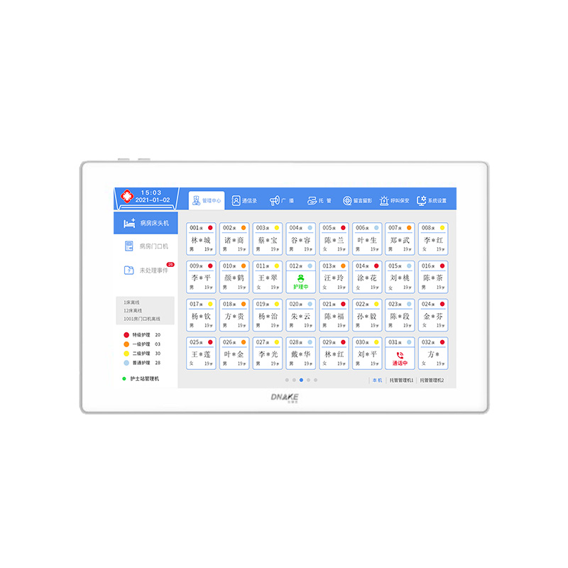 6)床位一覽表:可顯示每路病床智能終端、分機(jī)的患者信息,并支持接入病員一覽表顯示;可以顯示患者姓名、性別、年齡、床位號(hào)、護(hù)理等級(jí)。