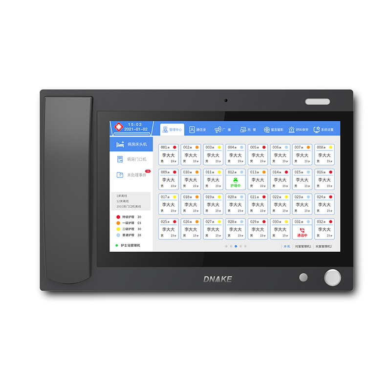 創(chuàng)新設(shè)置在護(hù)士站,可壁掛也可直接放在桌面上。主要接聽病區(qū)內(nèi)病床分機(jī)的呼叫以及患者信息查詢、廣播等基礎(chǔ)應(yīng)用功能,減輕醫(yī)護(hù)人員來回跑動的無效勞動和壓力,及時(shí)響應(yīng)患者需求,并做好醫(yī)護(hù)信息管理。