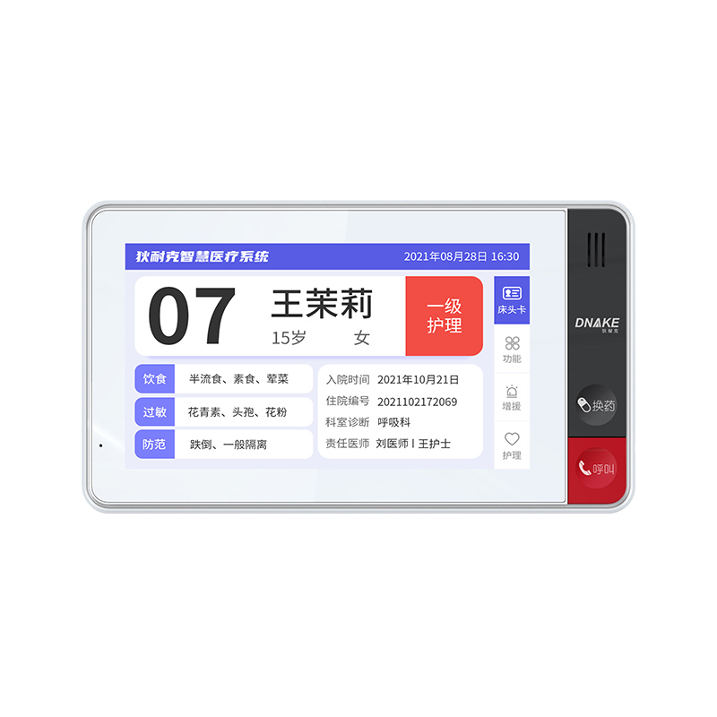 安裝在病床頭的交互設(shè)備機(jī),代替?zhèn)鹘y(tǒng)紙質(zhì)卡。產(chǎn)品支持呼叫對(duì)講、為住院患者提供病例查詢、狀態(tài)自動(dòng)提醒等護(hù)理需求等。