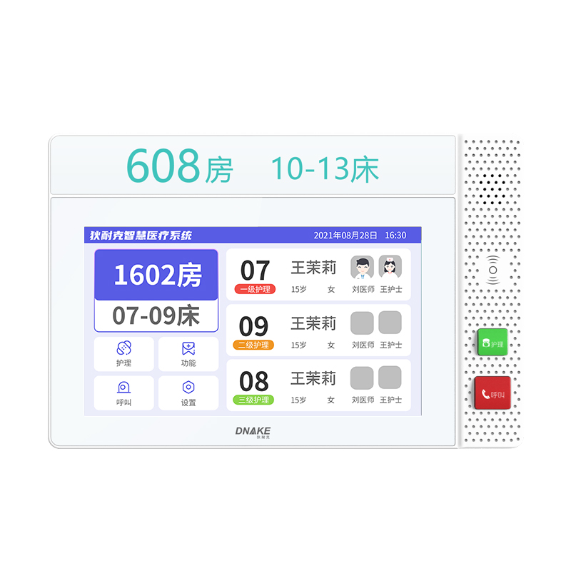 設置在病房門口的終端設備,主要用于顯示病房相關信息,內(nèi)置簡易醫(yī)護工作站,支持病房床位一覽、患者動態(tài)跟蹤、呼叫對講、增援求救等多種呼叫類型,信息齊全,及時響應醫(yī)護需求,實現(xiàn)智能化醫(yī)護管理。
